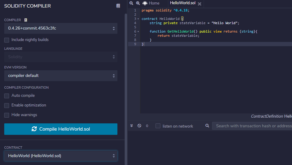 정상적으로 컴파일이 되었다면 그 바로 아래에 Contract에 아래와 같이 HelloWorld(HelloWorld.sol)이라고 컨트랙트가 생성이 됩니다.