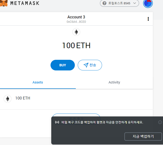 정상적으로 개인키를가져왔으면 아래와 같이 100ETH가 지갑에 표시되는걸 확인할 수 있습니다.