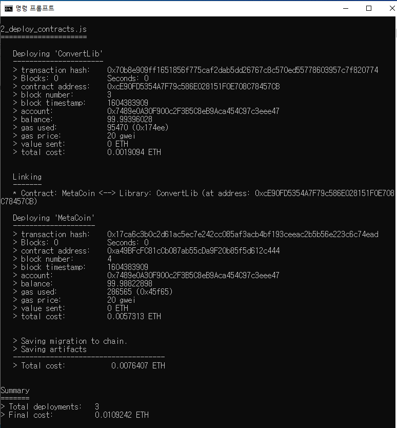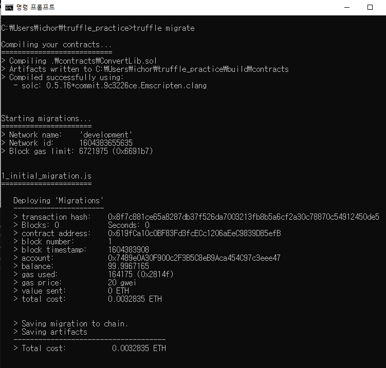 truffle migrate 명령어를 실행하면, 컨트랙트 컴파일 및 deploy 결과를 확인 가능합니다.