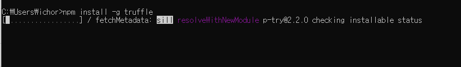 npm install -g truffle 를 명령프롬포트에서 입력하고 엔터를 치면, 아래와 같이 설치가 됩니다.