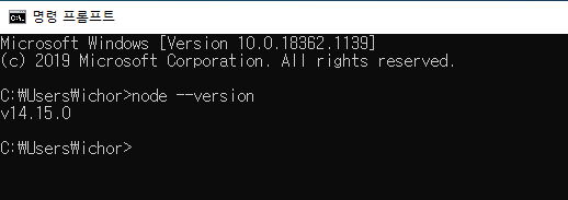 명령프롬포트창에서 node --version 을 입력하고 엔터를 치면, node.js가 정상적으로 설치가 되었고 그 버전이 어떠한지를 알려줍니다. 이렇게 되면 node.js는 정상설치된겁니다.
