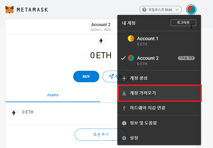 설치가 완료되었으면, 메타마스크 지갑에서 로컬호스트8545를 클릭해줍니다.