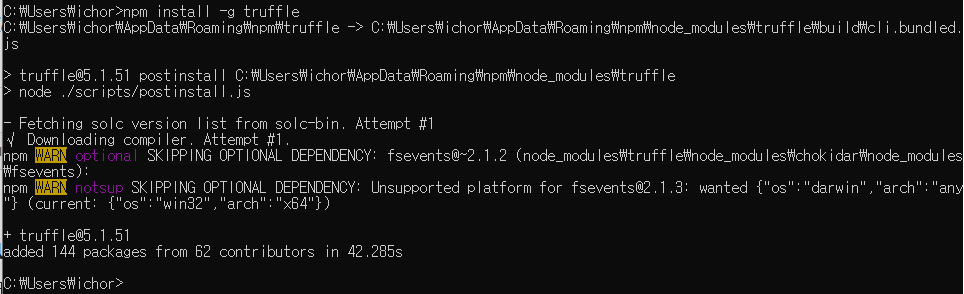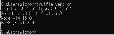 Node.js가 성공적으로 설치되었으면 아래와 같이 명령 프롬포트창에서 truffle를 설치할 수 있습니다.