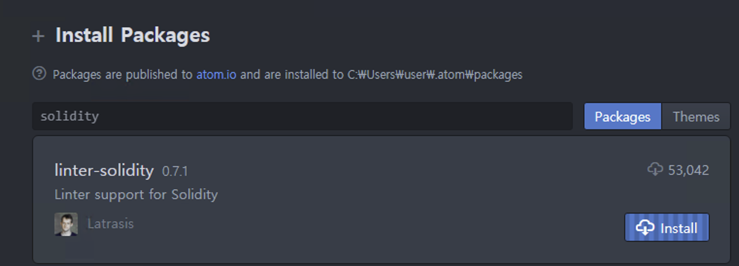 * 참고 [아톰 데이터에서 솔리디티 언어를 지원하는 툴은 아래와 같습니다.]