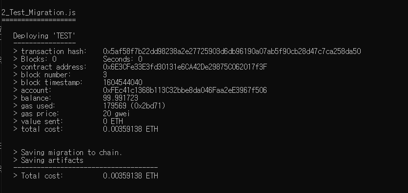 제일 아래에 우리가 작성한 2_Test_Migration.js 스마트컨트랙트 파일이 블록체인에 업로드 된걸 확인할 수 있습니다.