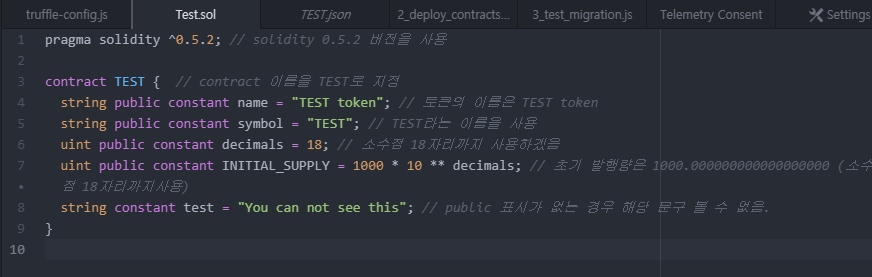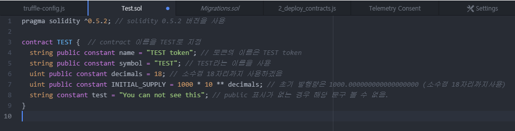 string public constant symbol = "TEST"; // TEST라는 이름을 사용