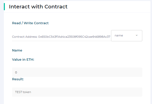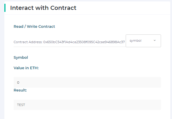 위에 보면 contract address가 나오는데, 이 주소를 기반으로 TEST라는 스마트컨트랙트와 통신이 가능합니다.