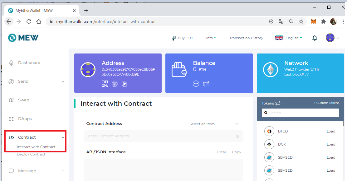 왼쪽 메뉴에 보면, Contract - Interact with Contract 메뉴가 있습니다.