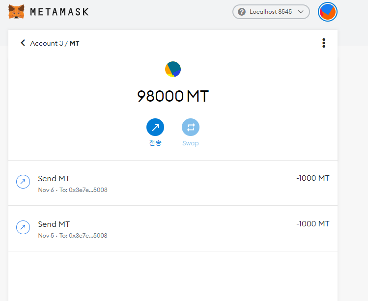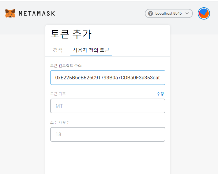 메타마스크에서 사용자정의 토큰추가를 하면(토큰컨트랙트 주소를 입력합니다.) 아래와 같이 토큰이 추가되는걸 확인할 수 있습니다.
