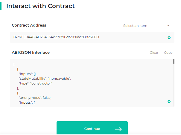 Contract address와 ABI를 복사하여 아래 myetherwallet에 붙여넣기합니다.