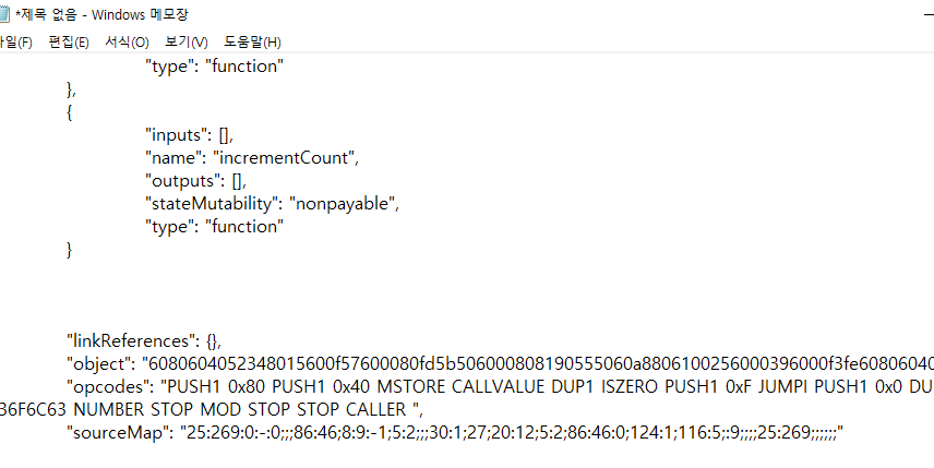 컴파일이 되면 ABI랑 Bytecode를 확인할 수 있습니다.