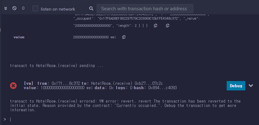 다른 계정으로 한번 더 이더를 보내면, 아래와 같이 Currently occupied라고 뜨면서 더 이상 예약 할 수 없는걸 확인할 수 있습니다.