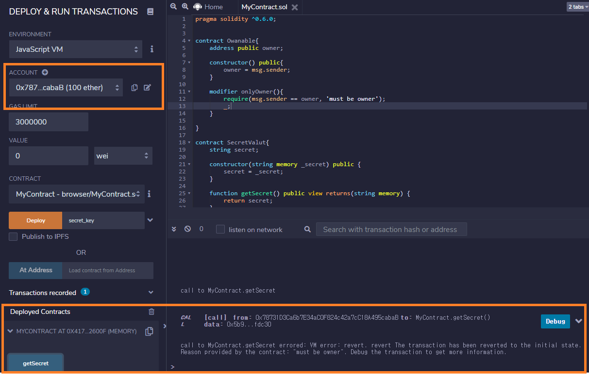 트랜잭션이 실패하고, must be owner만 가능하다는 에러문을 확인할 수 있습니다.