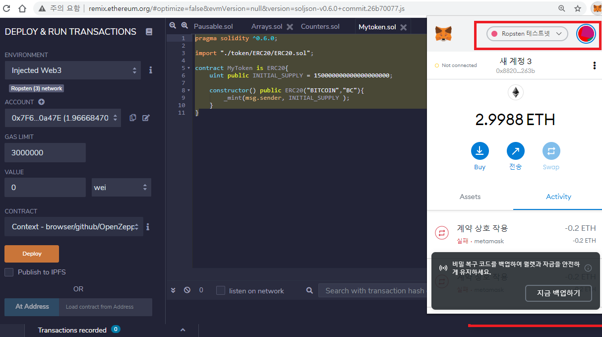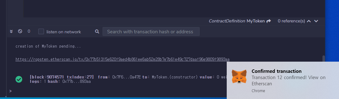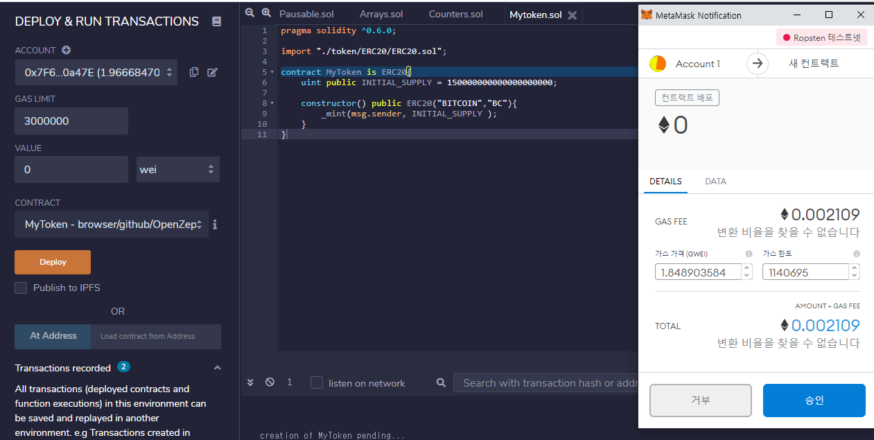 이제 모든 준비가 끝났습니다. 마지막으로 컨트랙트 MyToken을 선택해주고 Deploy하면 Ropsten테스트넷 계정으로 컨트랙트가 배포됩니다. (delploy 오른쪽에 토큰명, 심볼을 지정해줍니다.)