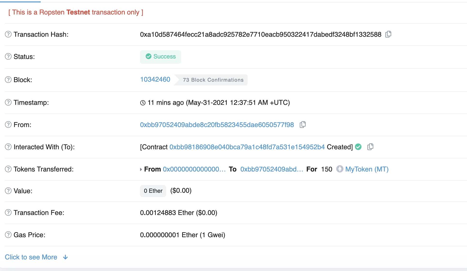 아래와 같이 150 MyToken(MT)이 만들어졌네요!!