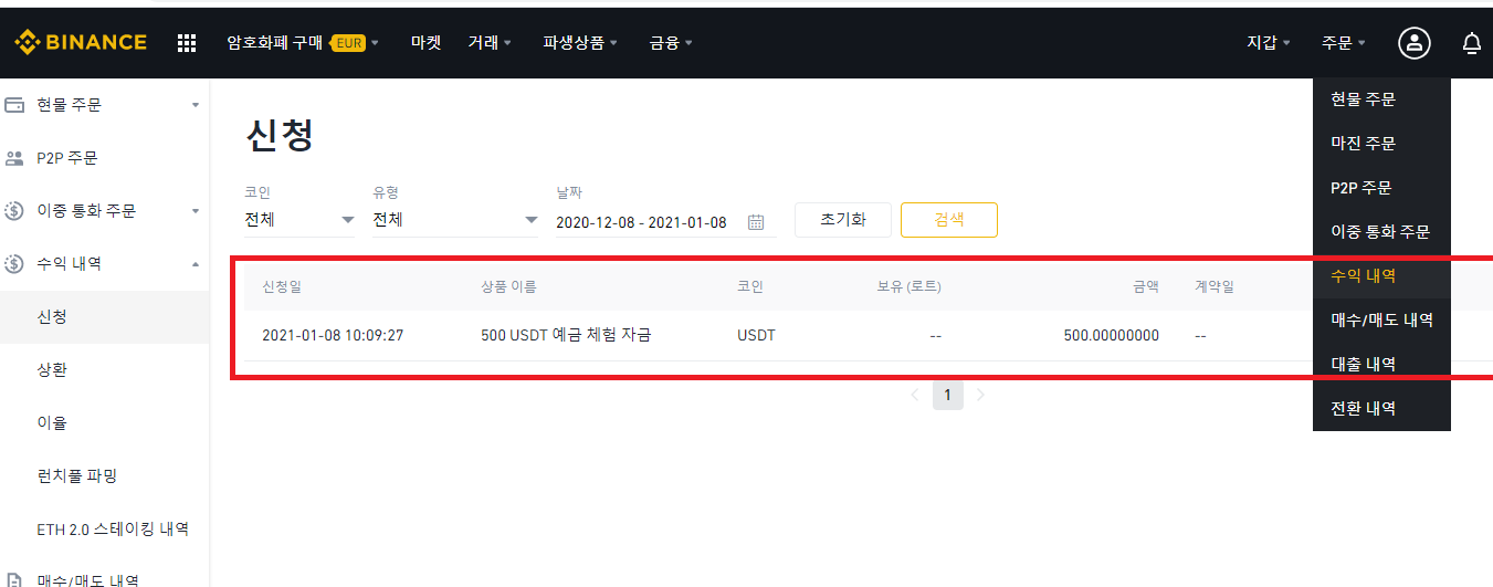 5) 메뉴의 수익내역을 확인해보면 정상적으로 수익신청이 되었는지 확인할 수 있습니다.