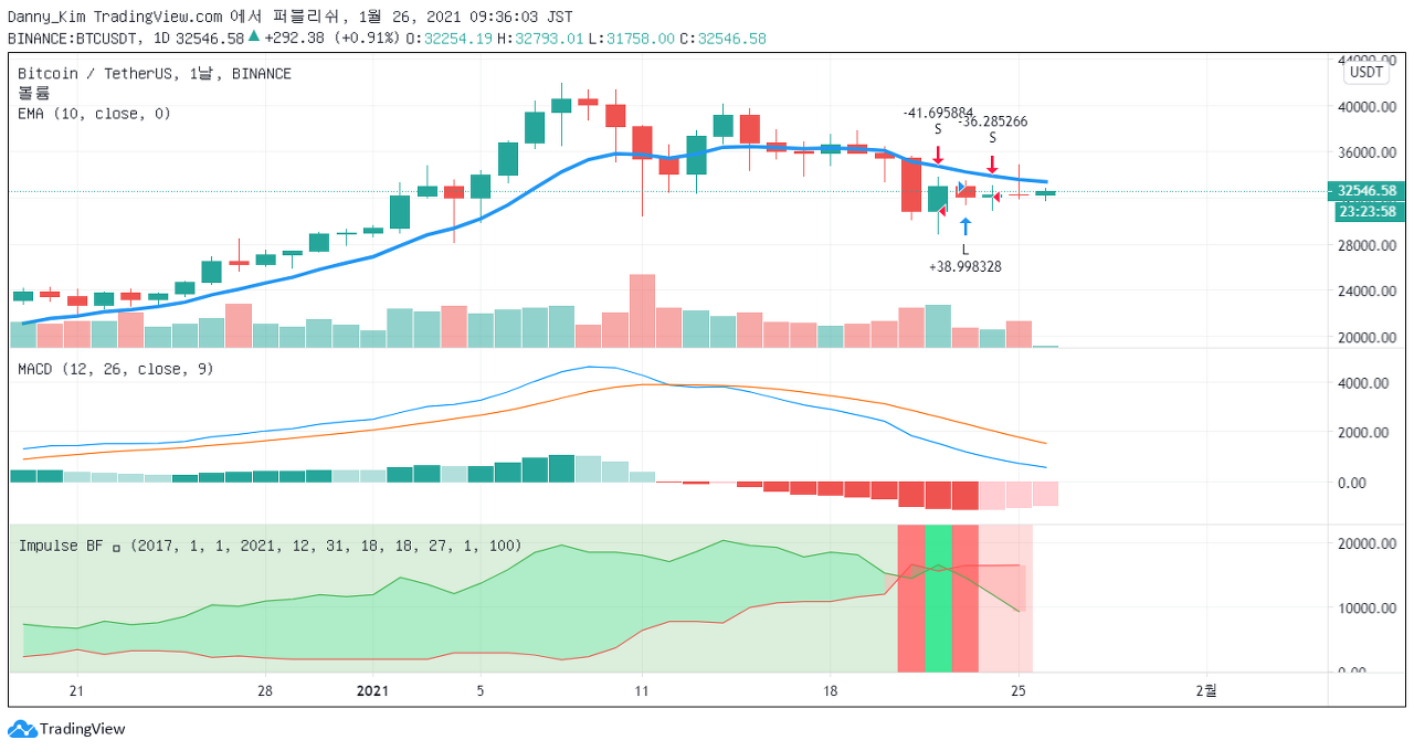 오늘은 임펄스를 활용해서 비트코인 매수,매도 타이밍을 잡을 수 있는지 테스트하고 있습니다.