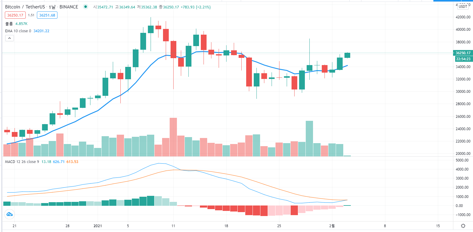 2. 일봉기준 MACD 교차발생, 단기상승전환으로 확인됨
