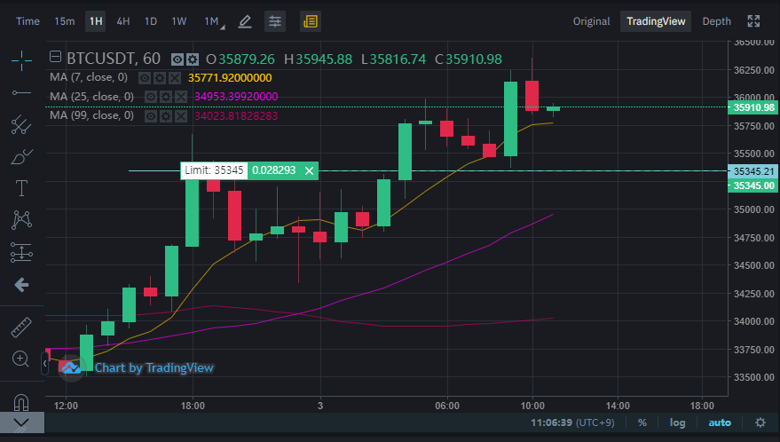 5. 매수 결정후 마지막 매수가는 시간봉 기준 이평선을 기준으로 단기선과 중기선의 중간지점에서 매수
