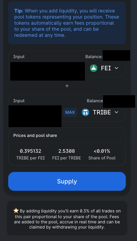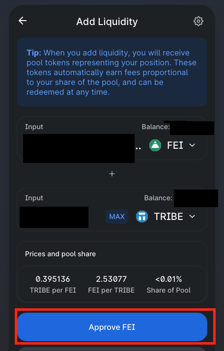 1. fei, tribe를 스테이킹 하기 위해서 Fei-Trible LP(Liqudity Providers)가 되어야 합니다.