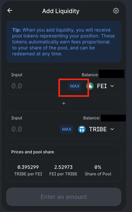 2. 가지고 있는 Fei최대치를 입력하면 자동으로 Tribe와의 수량을 조정해줍니다.