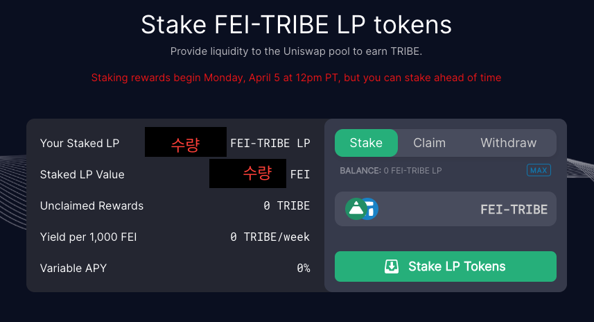 (Max를 누르면 최대 스테이킹 가능한 FEI-TRIBE LP 금액이 측정됩니다.)