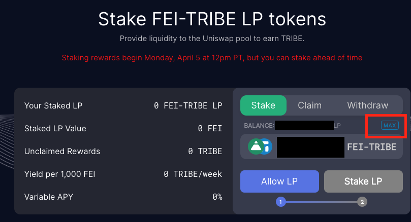 (Max를 누르면 최대 스테이킹 가능한 FEI-TRIBE LP 금액이 측정됩니다.)