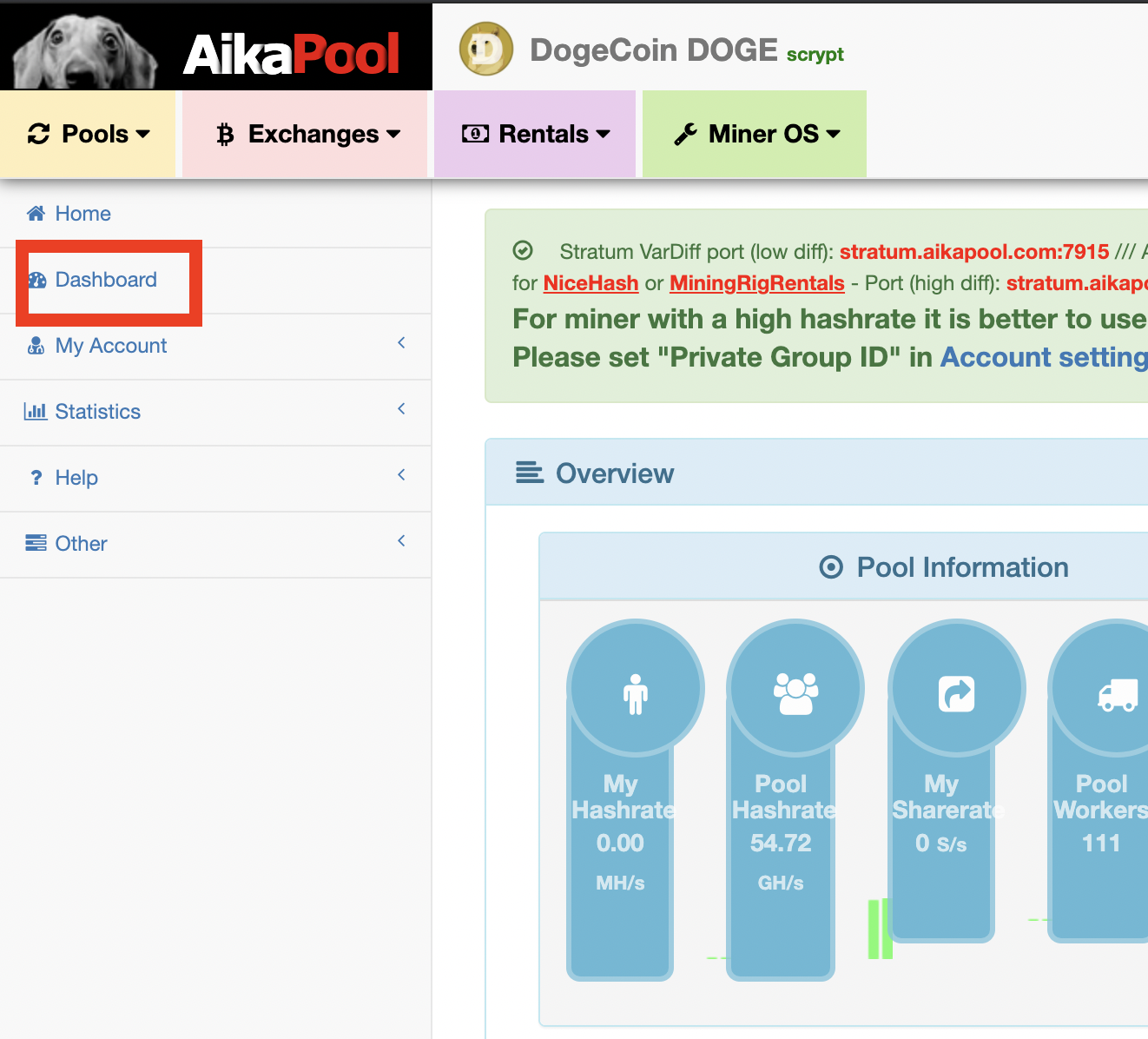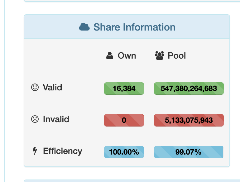 채굴이 잘되고 있는지 확인하려면, 아이카풀 Dashboad에서 ShareInformation에 자신의 기여도에 Own, Valid부분을 확인하면 됩니다.