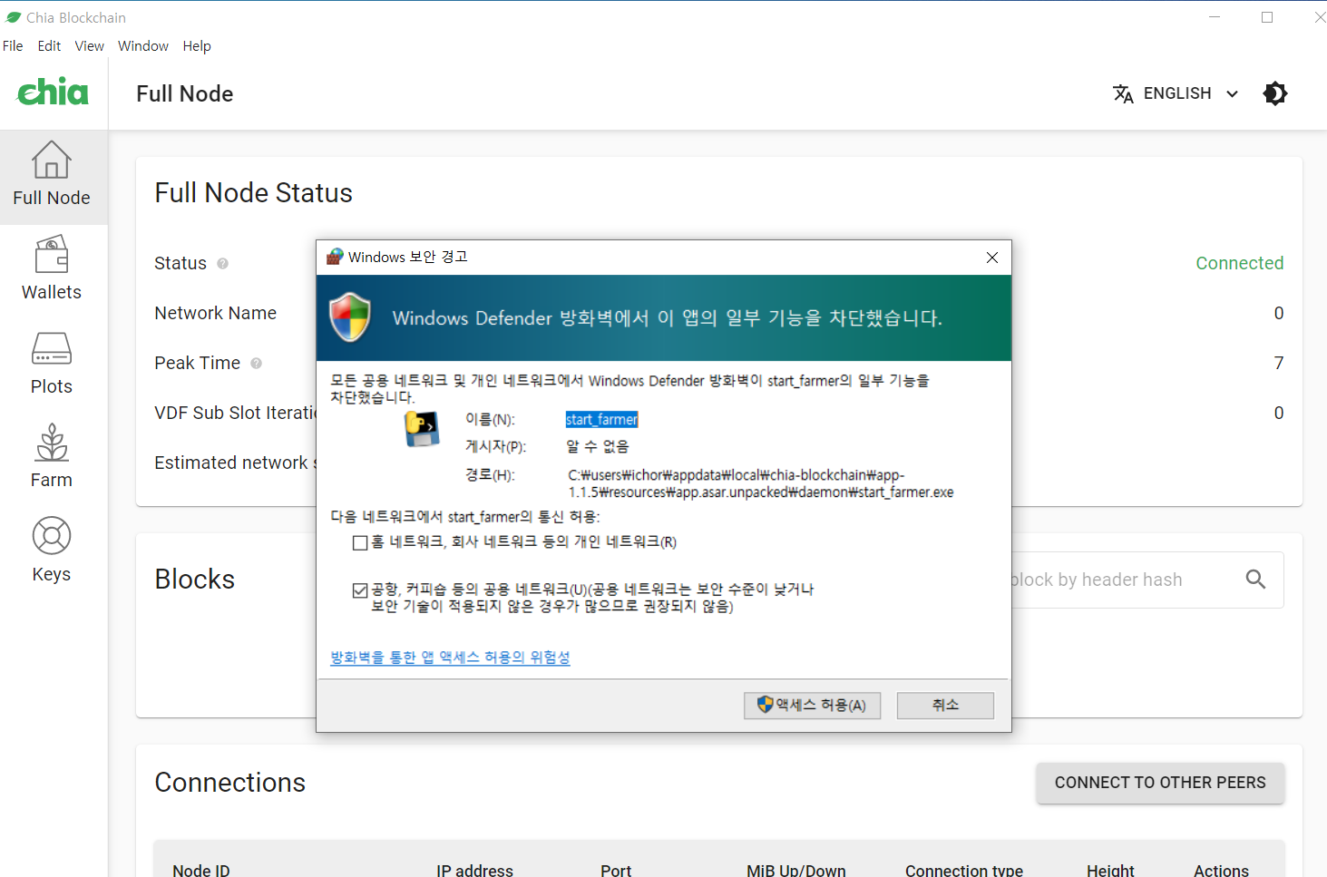 6. start_farmer 프로그램에 대해서 방화벽 차단허용을 해줍니다.