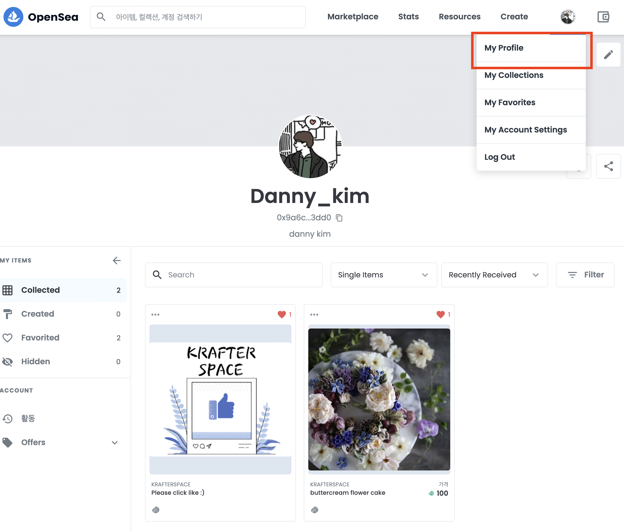4. 상단 오른쪽의 My Profile을 클릭하면 아래와 같이 KrafterSpace에서 발행한 나의 NFT가 연동되어 뜨는걸 볼 수 있습니다.