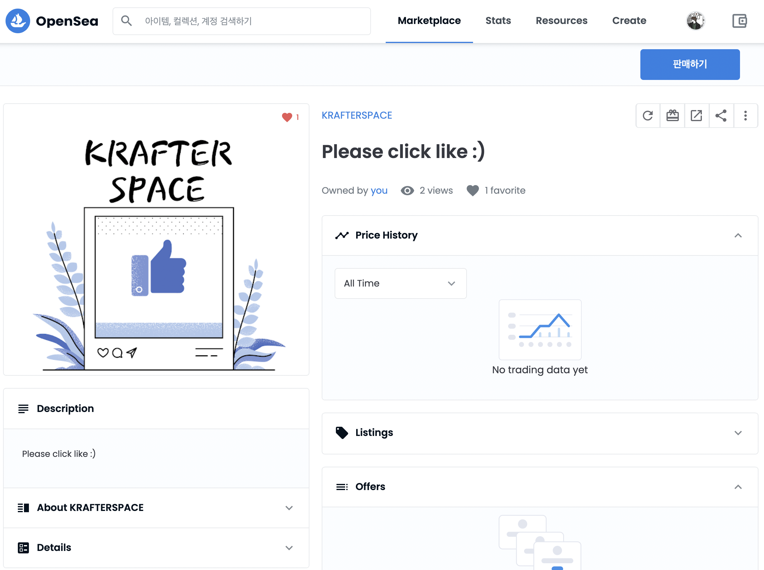 (혹시 아래 화면이 뜨지 않는다면 오픈씨 홈페이지에서 설정에서 네트워크를 KrafterSpace, Klytn등으로 선택하시면 됩니다.)