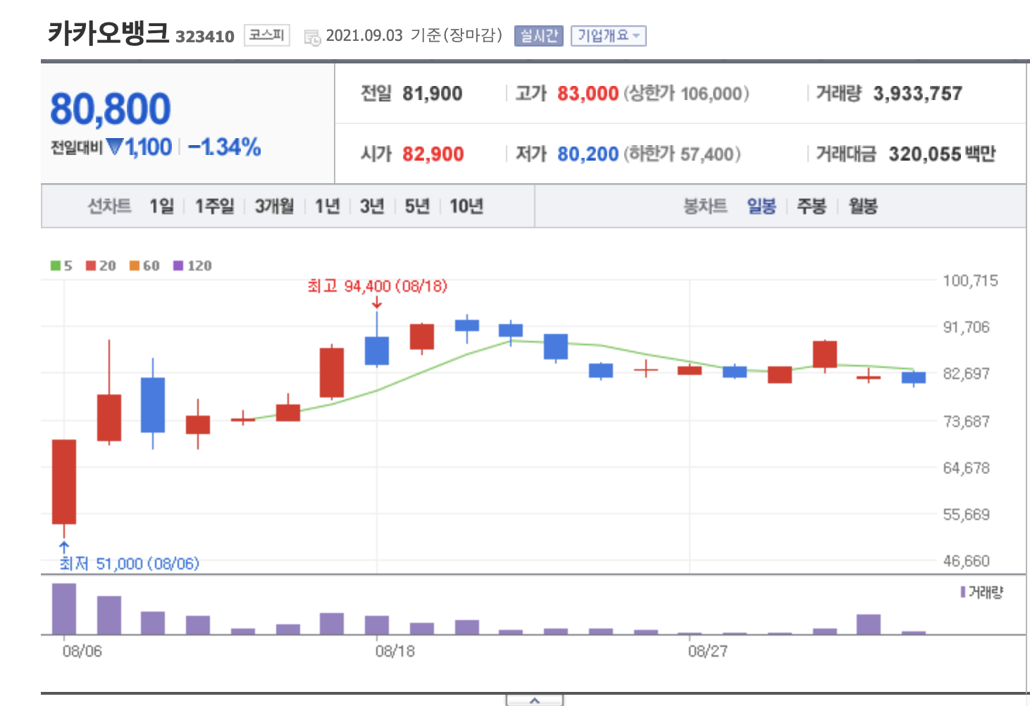 그리고 마지막으로 최근에 상장한 카카오뱅크(323410) 주식을 담아본다.