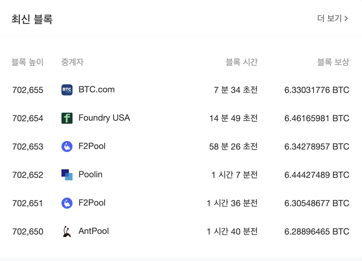 조금 더 설명을 하자면, 채굴자들이 모여서 저기 채굴풀(BTC.com, F2Pool, AntPool 등)에서 같이 모여서 채굴을 하고 채굴에 성공하면, 함께 채굴한 사람들이 저 6.33 BTC를 나눠서 가지는 구조다. (처음부터 비트코인이 이런 계획이 있었던건 아닌데 시간이 지나면서 지금의 이런 채굴풀 시장이 형성이 되었다.)