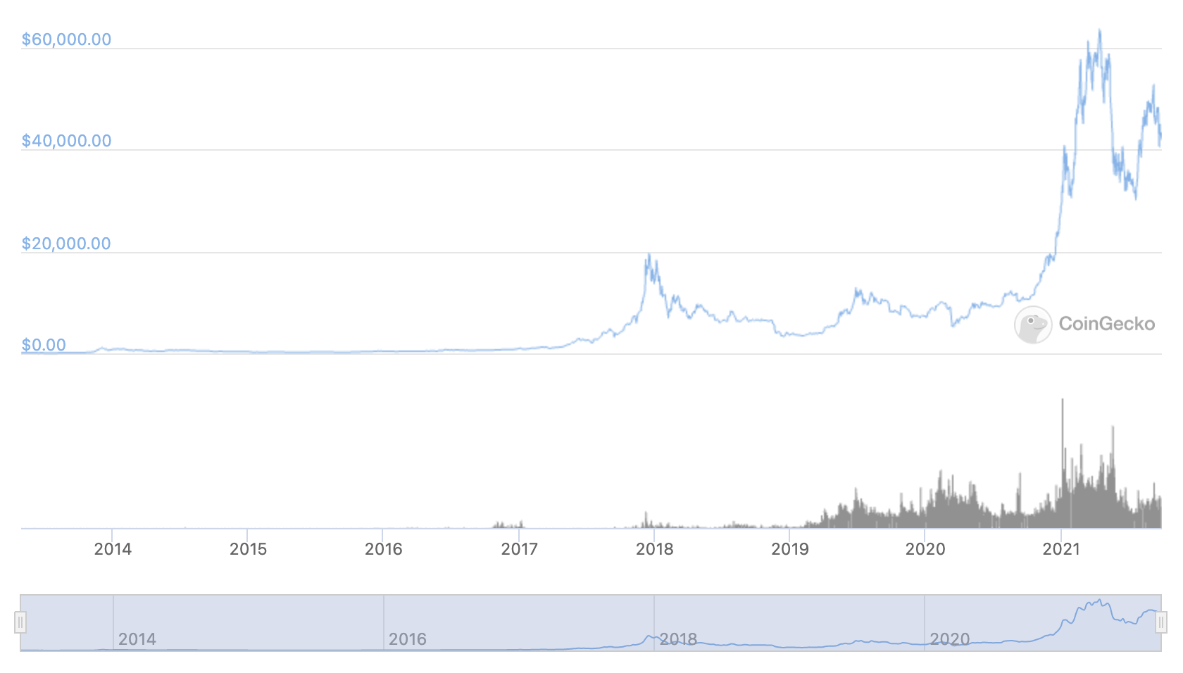 2017년을 기점으로 비트코인은 $1,000을 넘었고 2018년 $20,000이 조금 안되게 올라갔다가 2019년부터 본격적으로 거래량이 증가하기 시작했다. 그렇게 진행된 비트코인은 2021년을 기점으로 가장 많은 거래량과 더불어서 $60,000을 넘어섰고 오늘 글을 쓰는 시점에는 $40,000에서 $50,000 그리고 때로는 $30,000 사이를 오고가고 있다. 앞으로 $100,000을 달성할것이라는 기대와 함께 다시금 폭락장이 시작될꺼라는 우려목소리도 함께 시장에서는 나오고 있다. [2021년 9월 29일 기준]