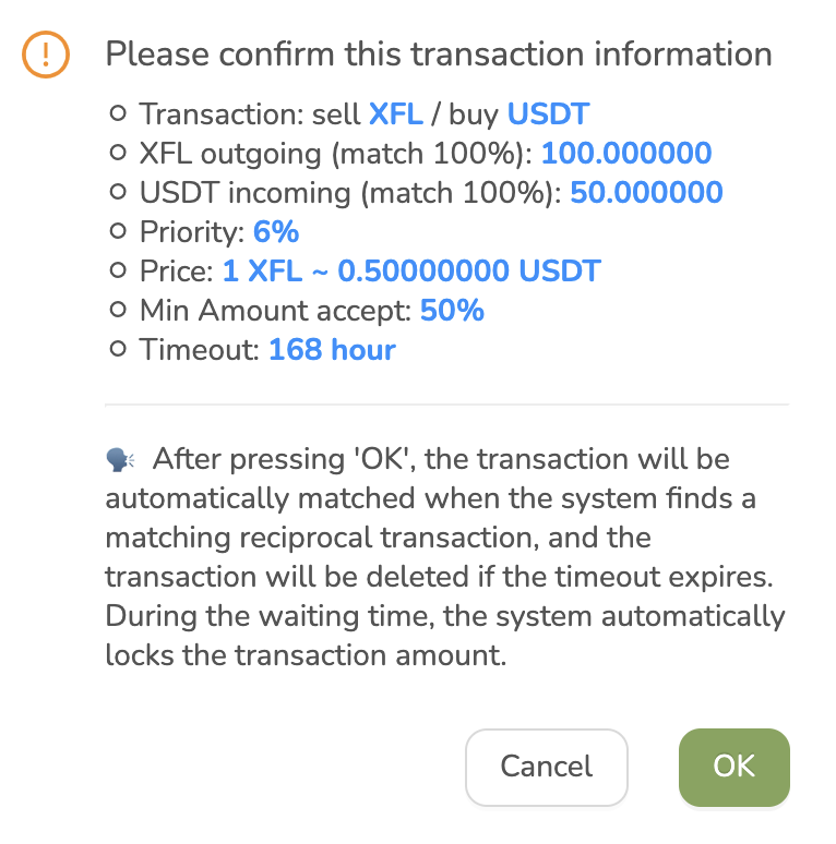 판매할 코인의 갯수를 정합니다. 저의 경우 100으로 했습니다. 그리고 아래에 코인을 usdt로 선택하면 알아서 시장가에 맞추어서 가격을 선정합니다. 이 가격이 마음에 안든다면 좀더 높여서 설정할 수 있습니다. 그리고 min AMT는 최소 50%도 거래가 가능하다는 의미이므로, 100%를 설정하면 100% 다 교환을 원하는 거래자에게만 판매가 됩니다. (즉 최소 판매량을 정하는거죠..)