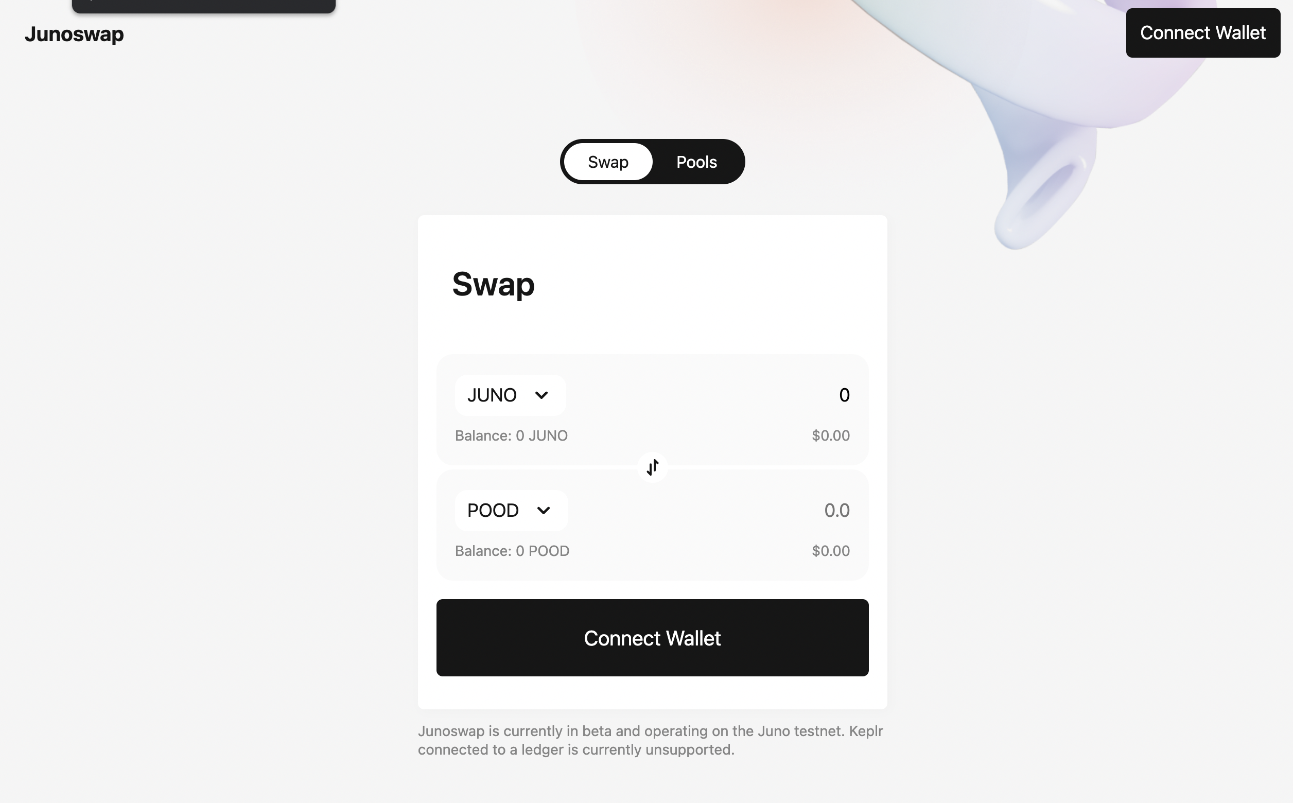 주노스왑이다.기본적인 Dex이면서, Pool들이 추가될 예정이다. 아직은 사용할 수 없으며 대략적인 모습만 볼 수 있다. 홈페이지의 아래 링크를 들어가보면 https://github.com/Wasmswap/wasmswap 관련 dex의 소스들을 확인해 볼 수 있다.