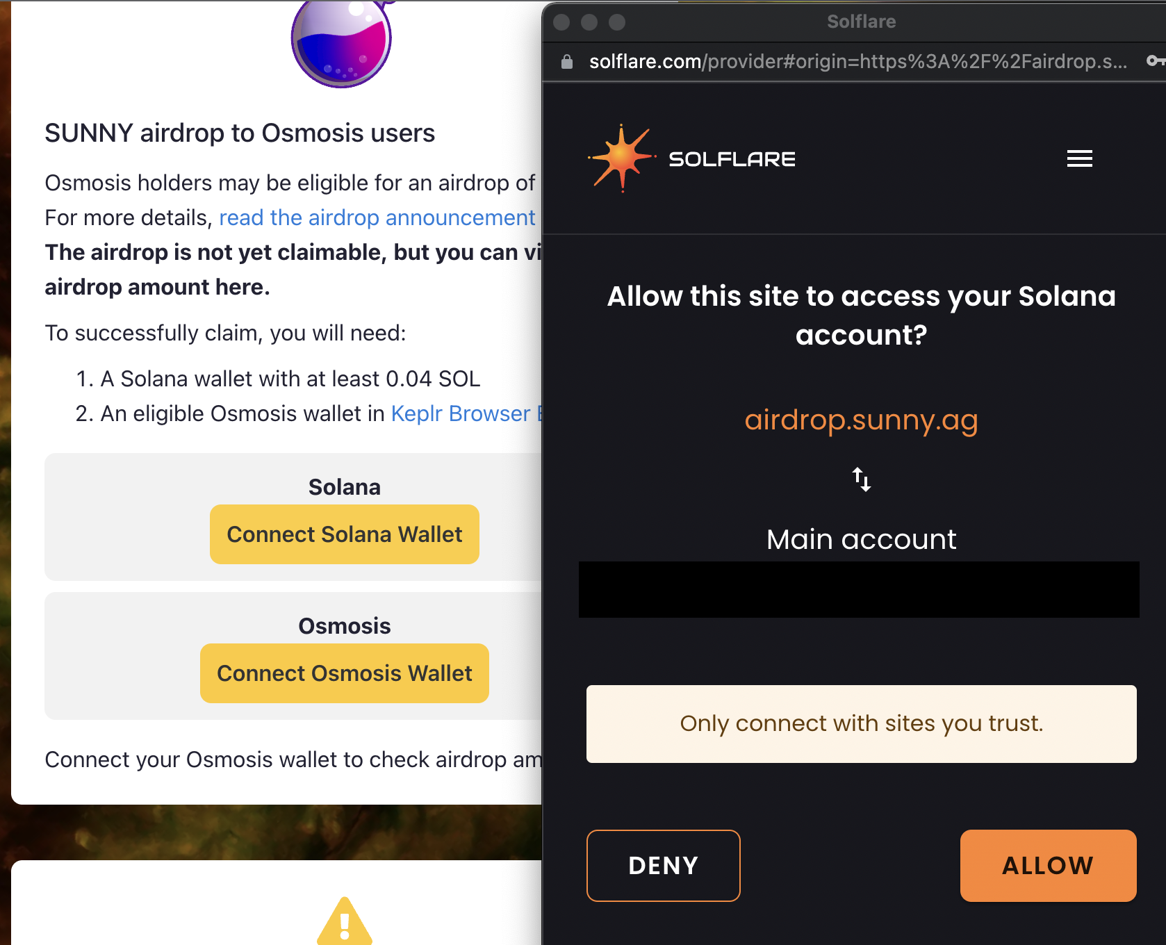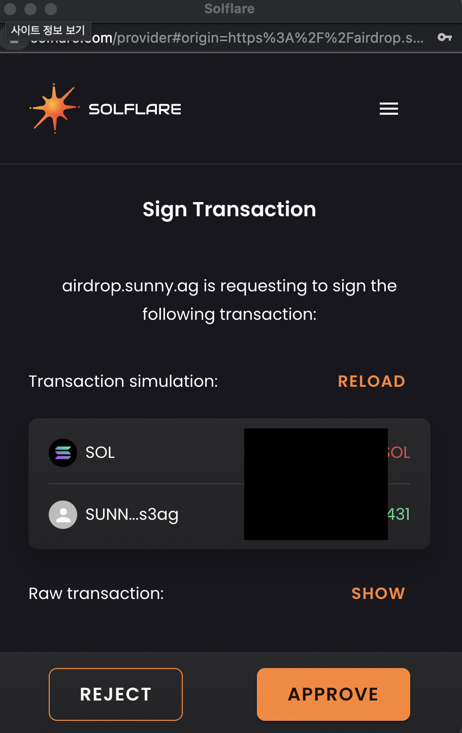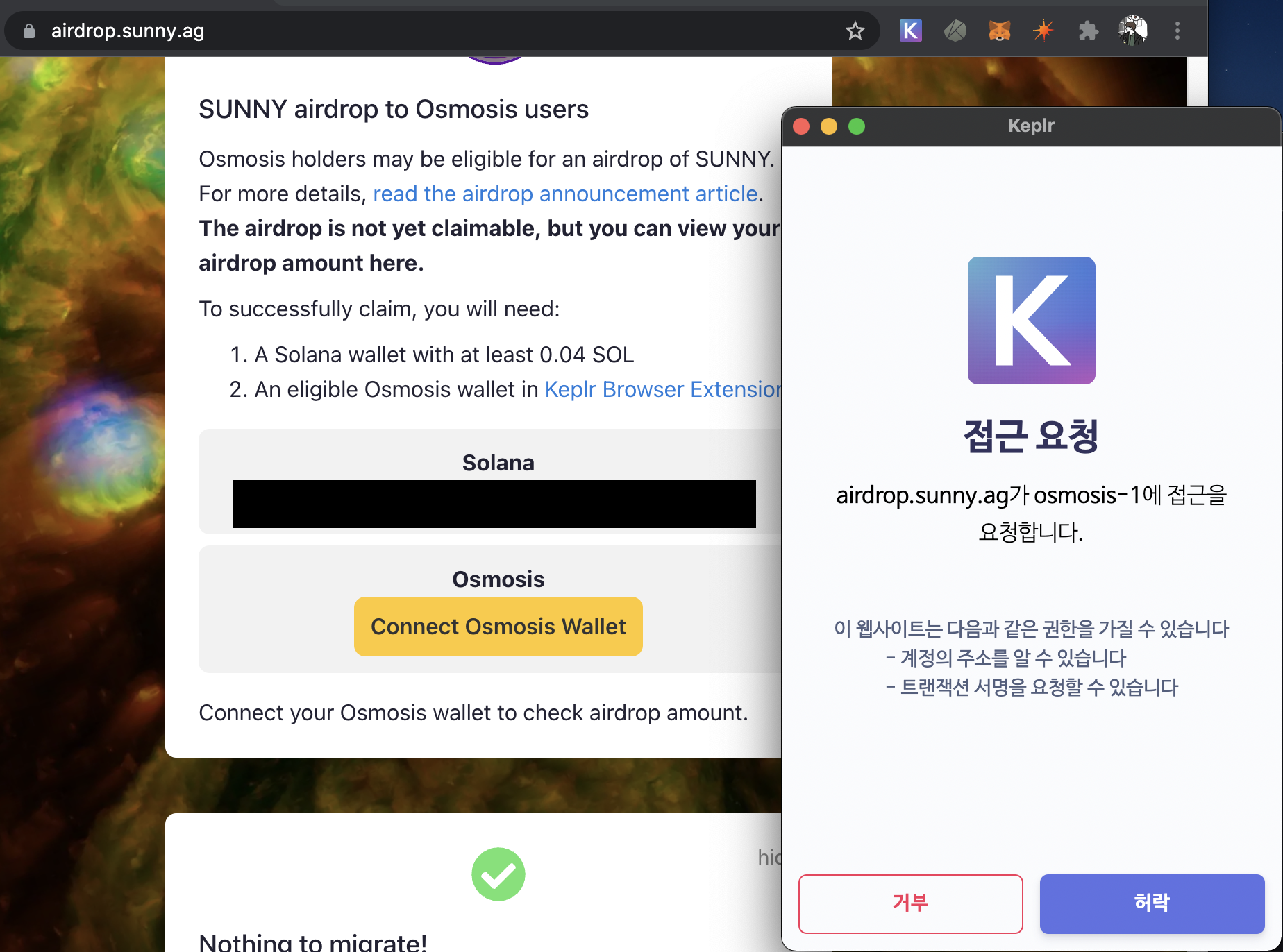 7. 입금이 정상적으로 되어 0.04SOL 이상 있으면 아래와 같이 승인하여 에어드랍 받을 수 있습니다.