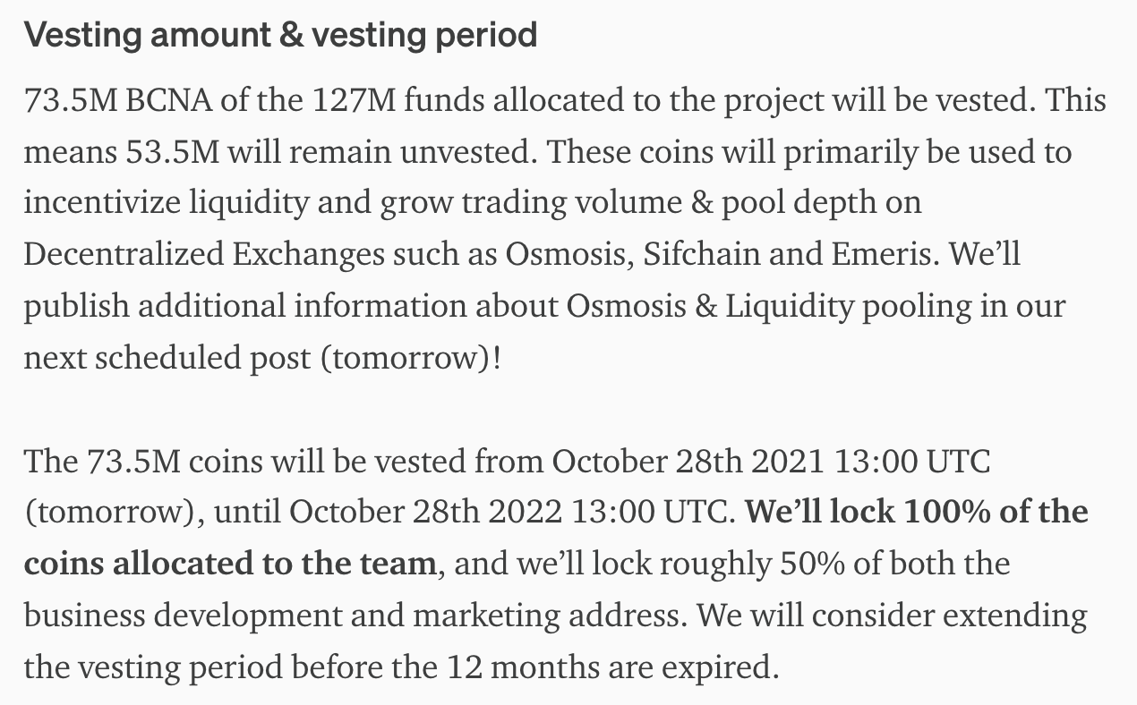 3) 팀물량 : 57,324,341 BCNA (5천 7백만개) [현재 $0.21 기준 12M달러정도(원화로 140억원정도)]