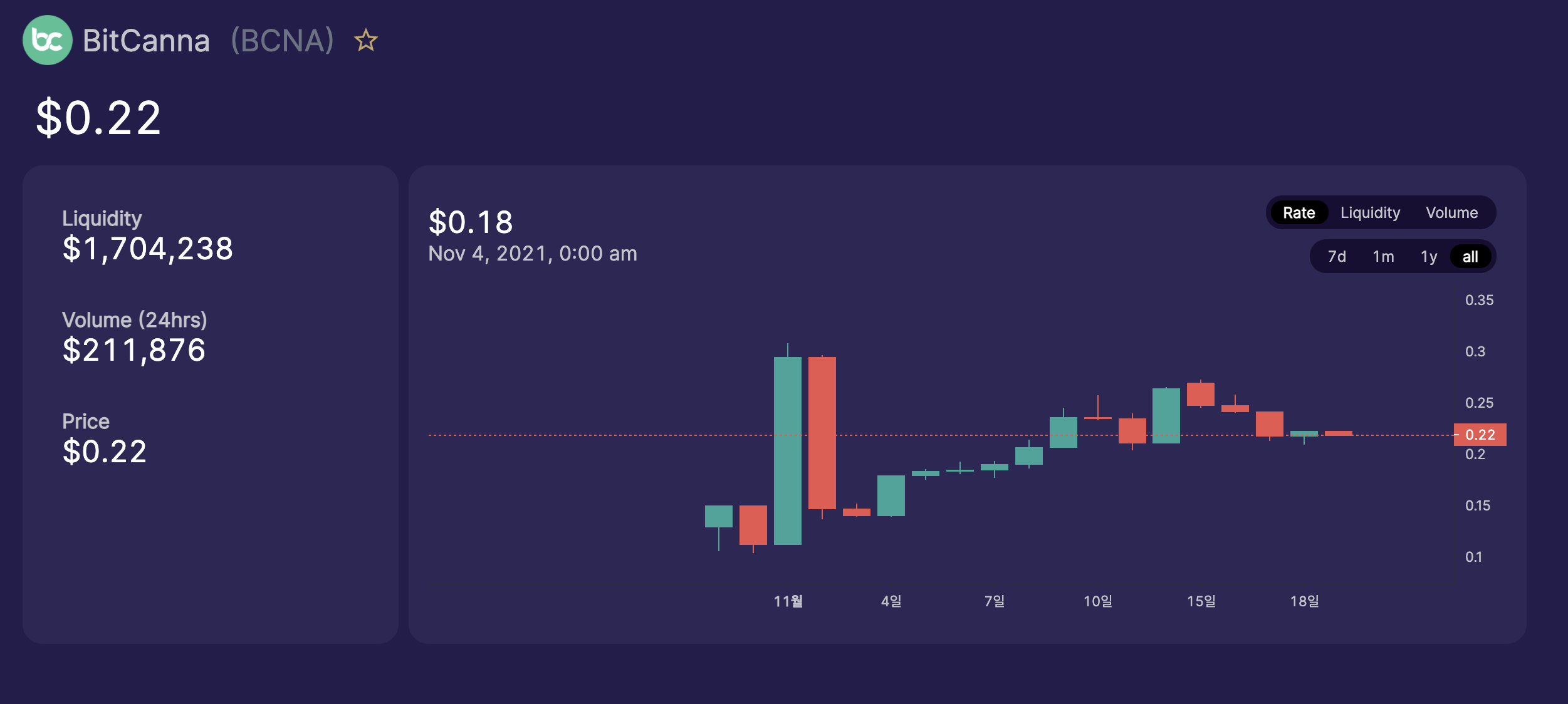 2) 유통량 : 262,786,580 BCNA (2억 6천개) [현재 $0.21 기준 55M달러정도(원화로 640억원정도)]