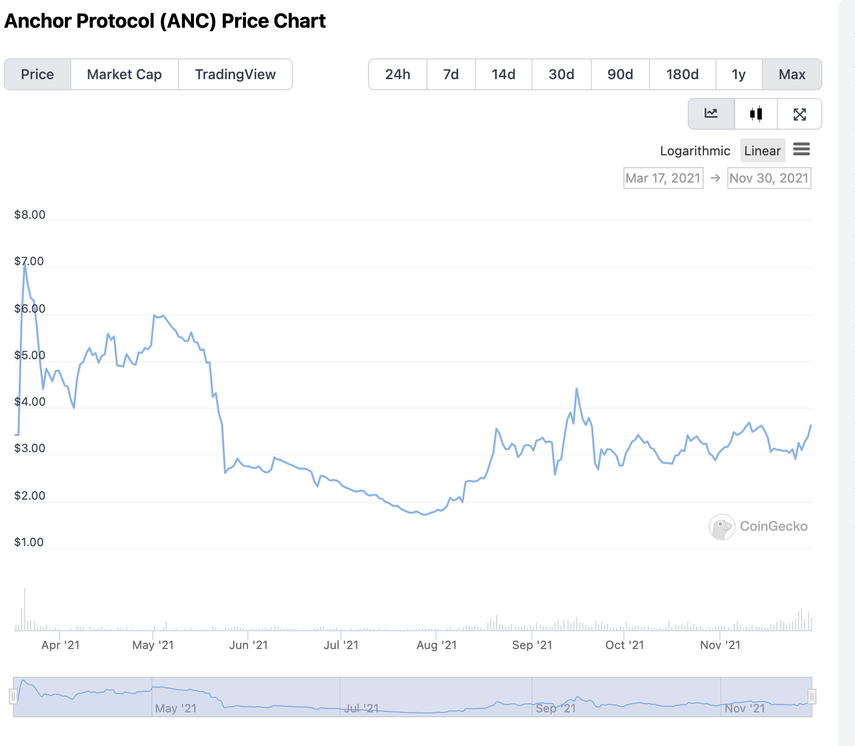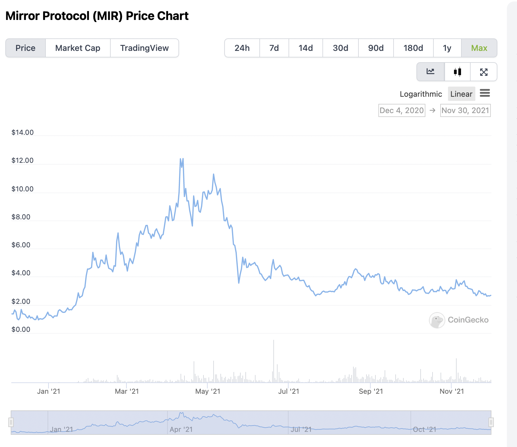 - 미러프로토콜은 21년 1월경 런칭하였고 런칭당시 $1 거래되었고 5월경 최대 $12까지 상승하였으며 6월 이후 $3 이하로 거래되고 있고 현재(21년 11월 30일기준) 는 $2.67에 거래되고 있다.