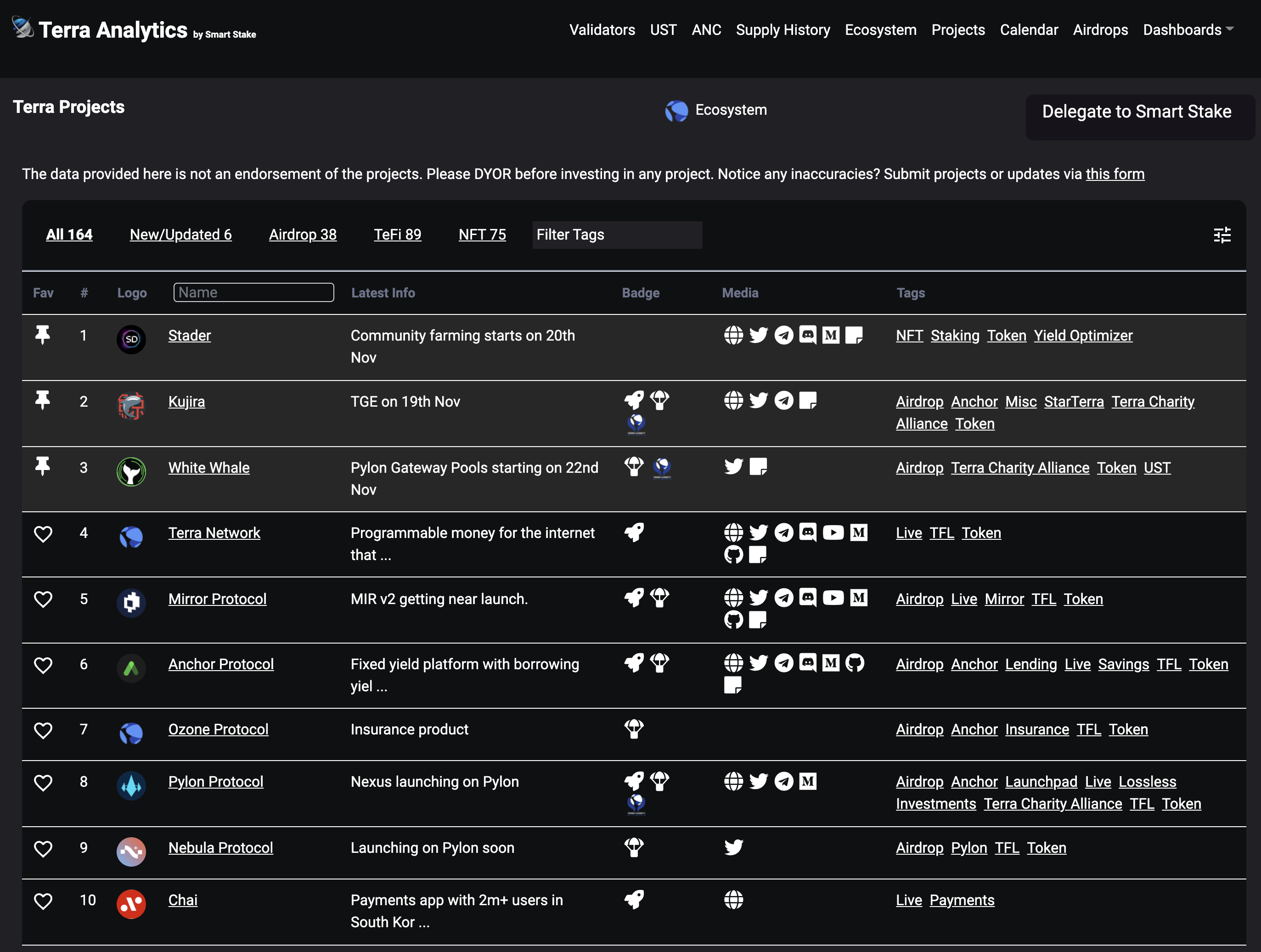 - Terra Analytics(https://terra.smartstake.io/projects) 를 확인하면 현재 진행중인 테라프로젝트들과 진행예정인 프로젝트들의 상세정보를 확인해 볼 수 있다.