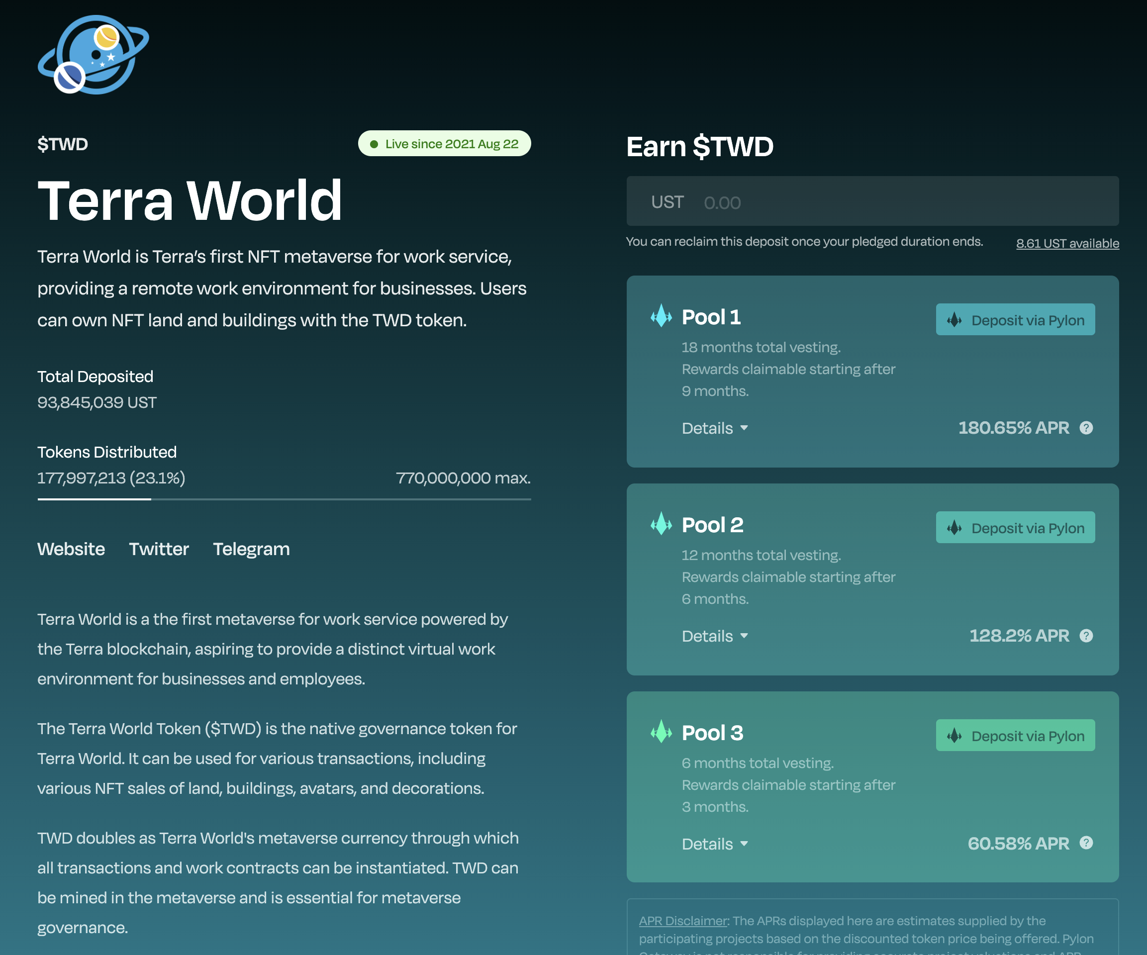 - 예치한 기간에 따라서 APR (아래에 풀 1은 18개월 예치하고 180% 연이율에 해당하는 TWD토큰을 일정 시점 이후에 받게 된다.)