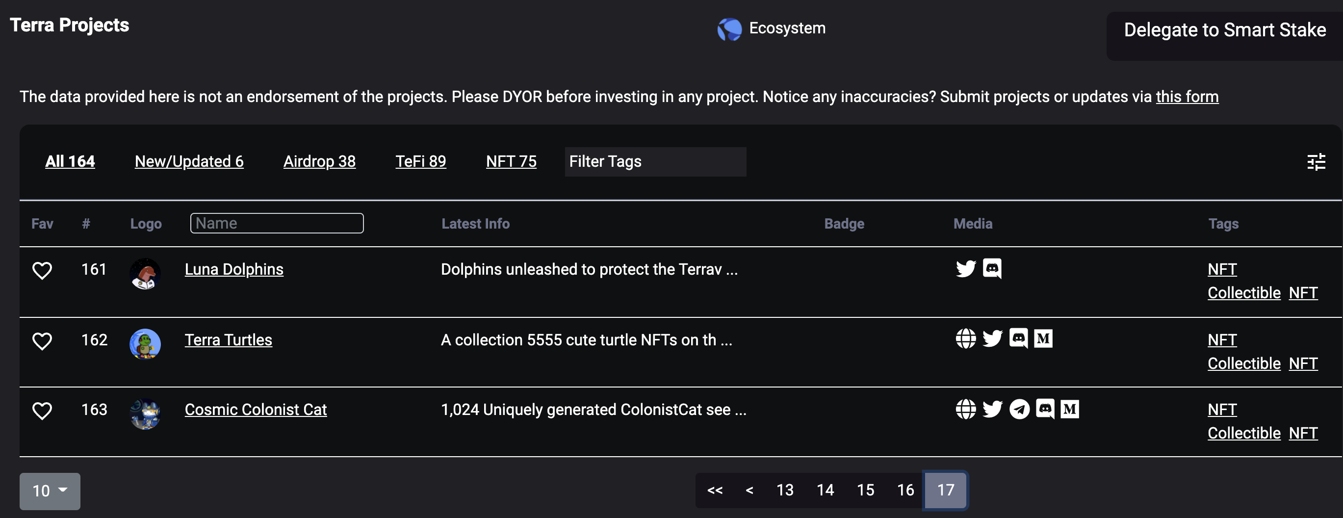- 마지막 페이지까지 확인해보면 163개정도의 리스트가 등재되어 있다. 앞으로 더 추가될 여지까지 생각해보면 테라 생태계 내에 꽤나 많은 프로젝트들이 지속적으로 생길걸 알 수 있다.