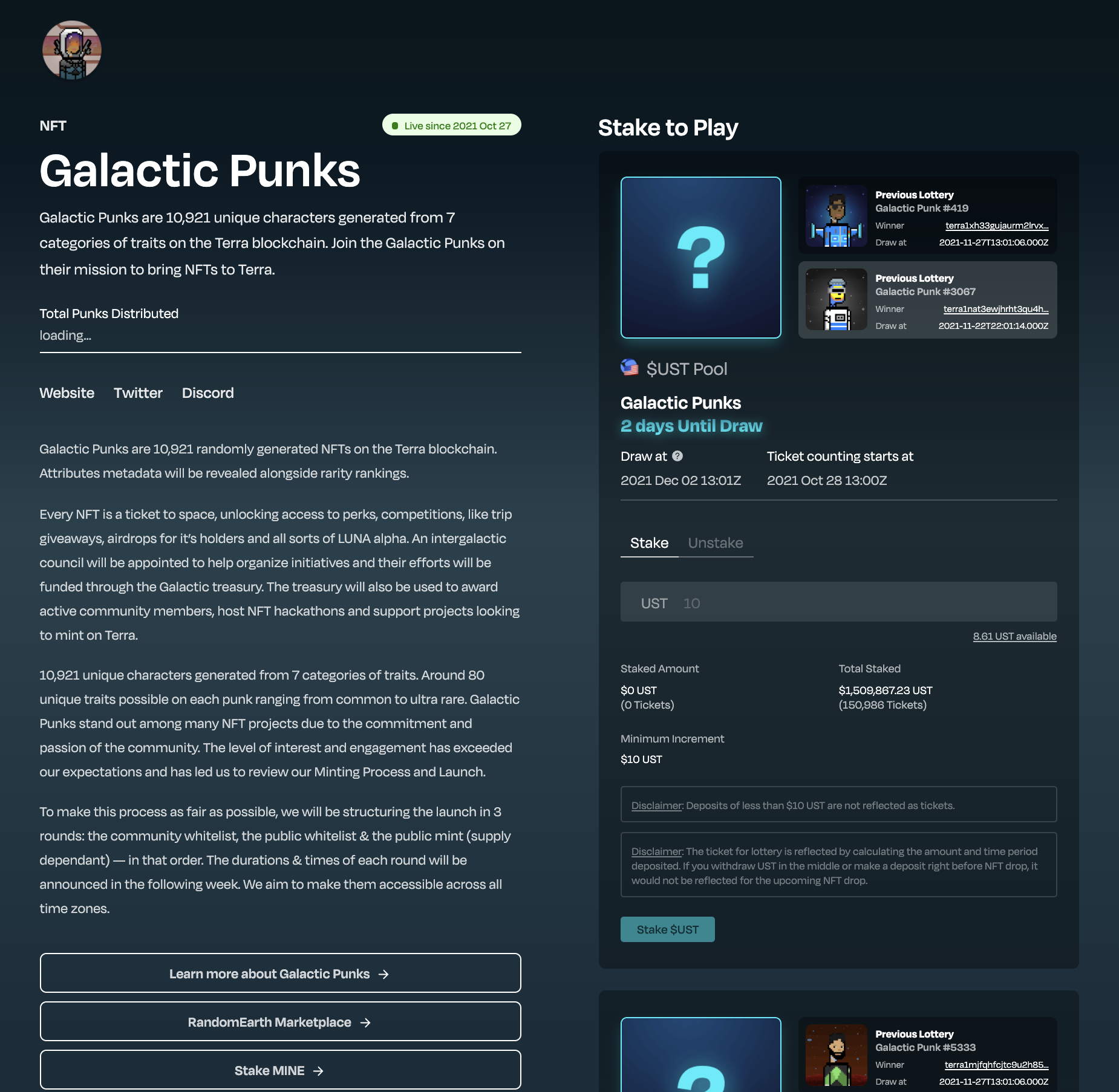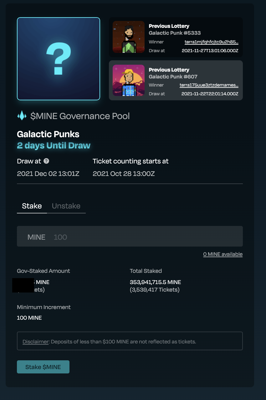 - 현재 진행중인 Galactic Punks NFT 프로젝트의 경우 UST로 티켓팅에 참여할 수 있고, 또한 MINE를 스테이킹 하고 있으면 오른쪽에 보이는 MINE Governance Pool에 자동으로 티켓팅이 부여되어서 NFT의 당첨기회를 가져볼 수 있다.