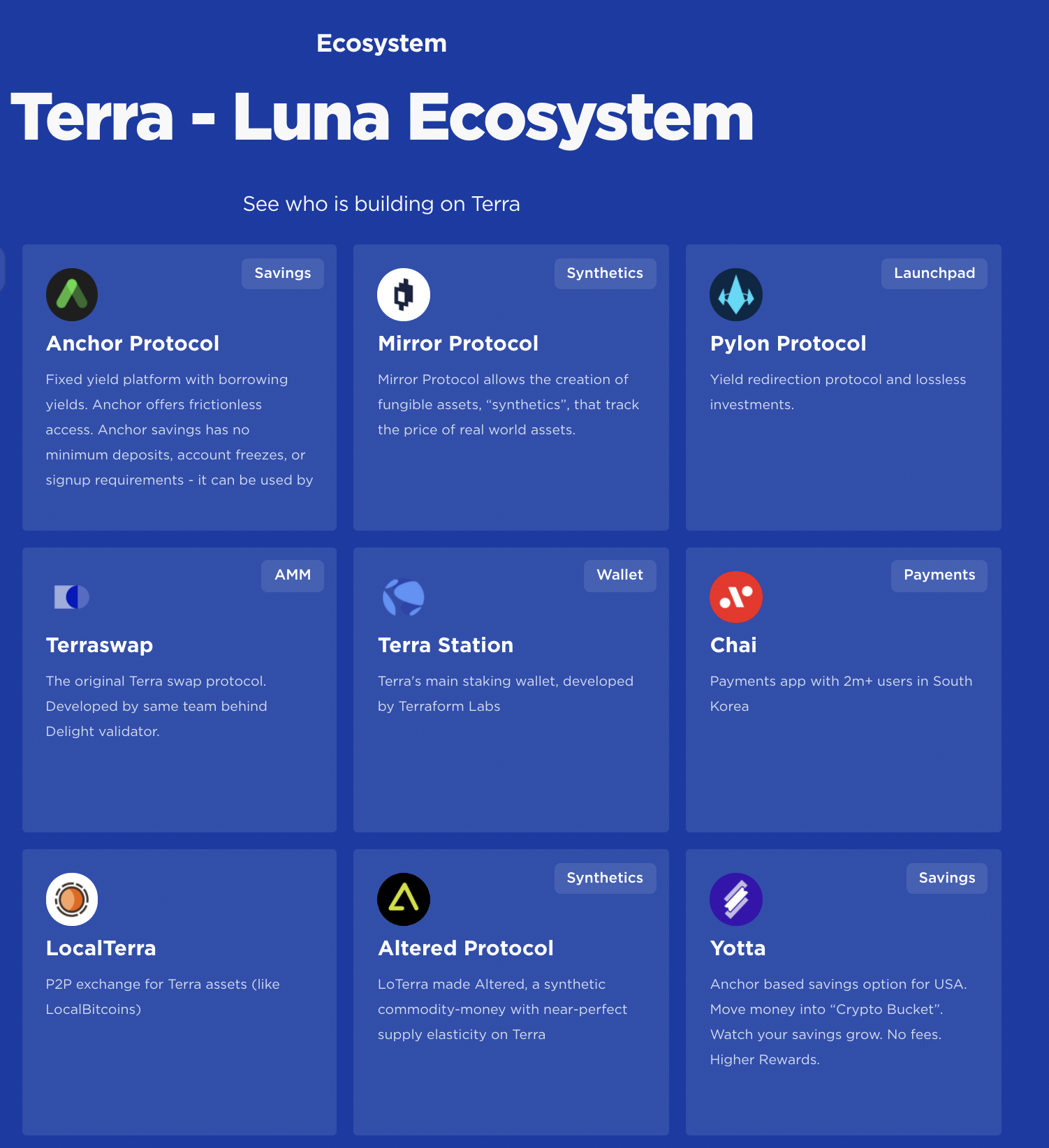 - 여기에 있는 프로젝트들 중에서 첫번째 보여지는 Anchro Protocol, Mirror Protocol, Pylon Protocol을 먼저 유심히 살펴볼 필요가 있다.