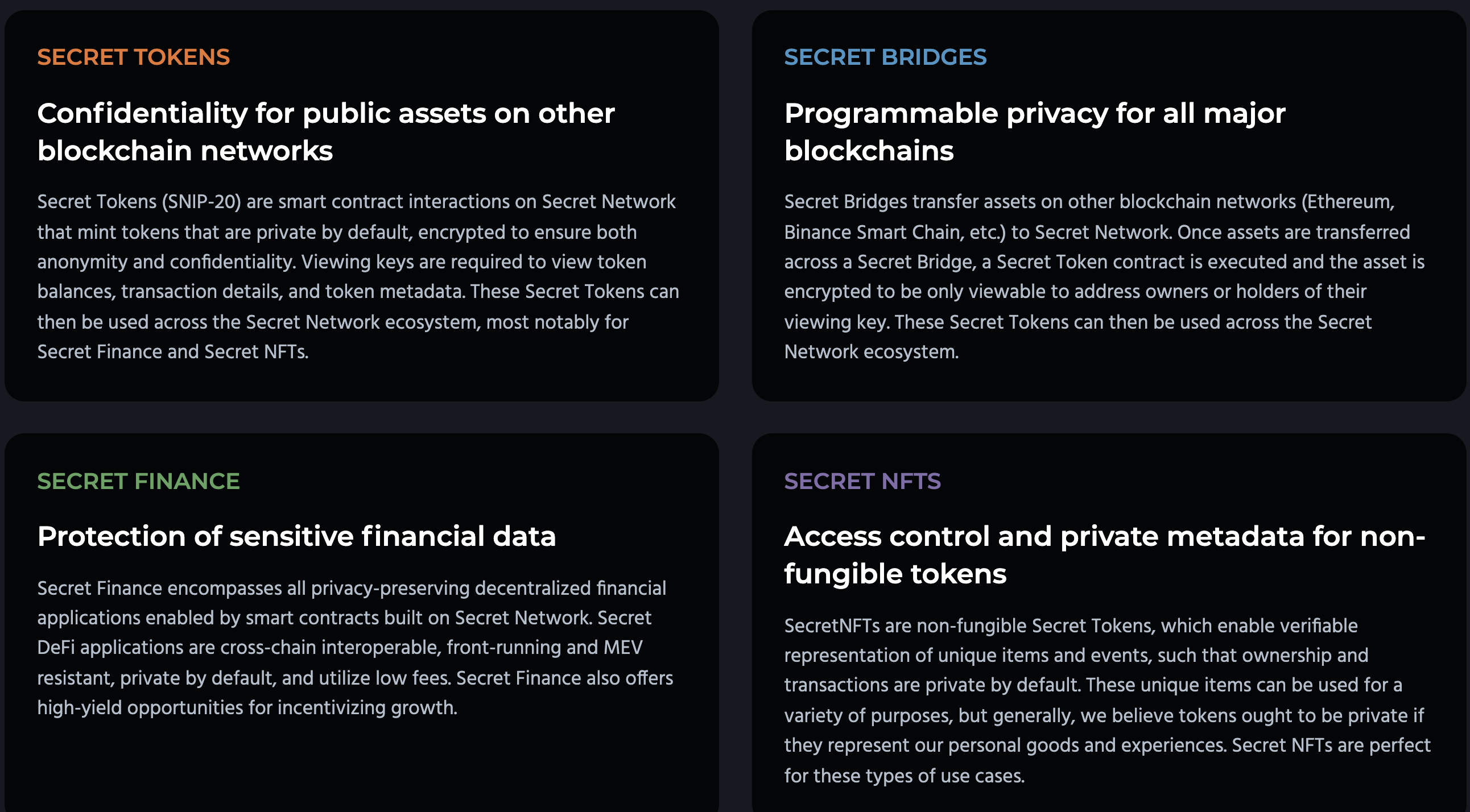 - 시크릿네트워크는 TEEs(Trusted Execution Environments) 기술을 사용해 보안과 프라이버시를 향상시킨다.