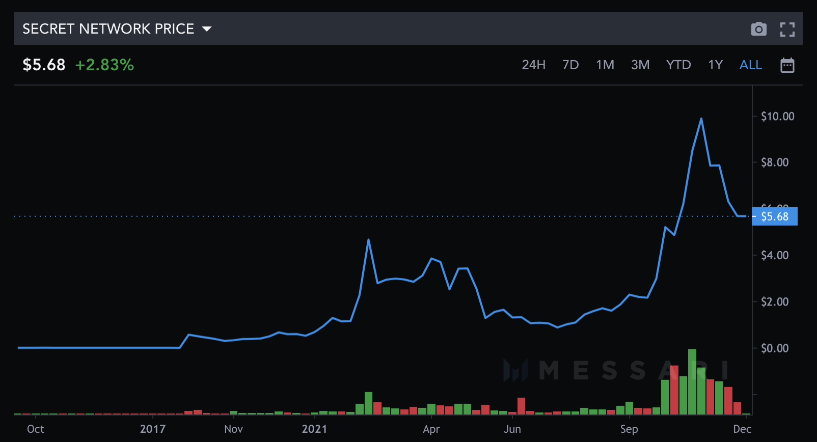 - 최근 1년의 가격을 살펴보면, 21년 3월경에 거래량이 증가하면서 $2~3$가격이 형성되었고, 조정기간($1) 이후에 최근 10월 이후 거래량이 늘면서 $10까지 상승하였다가 현재는(21년 12월3일) $5.69에 거래되고 있다.