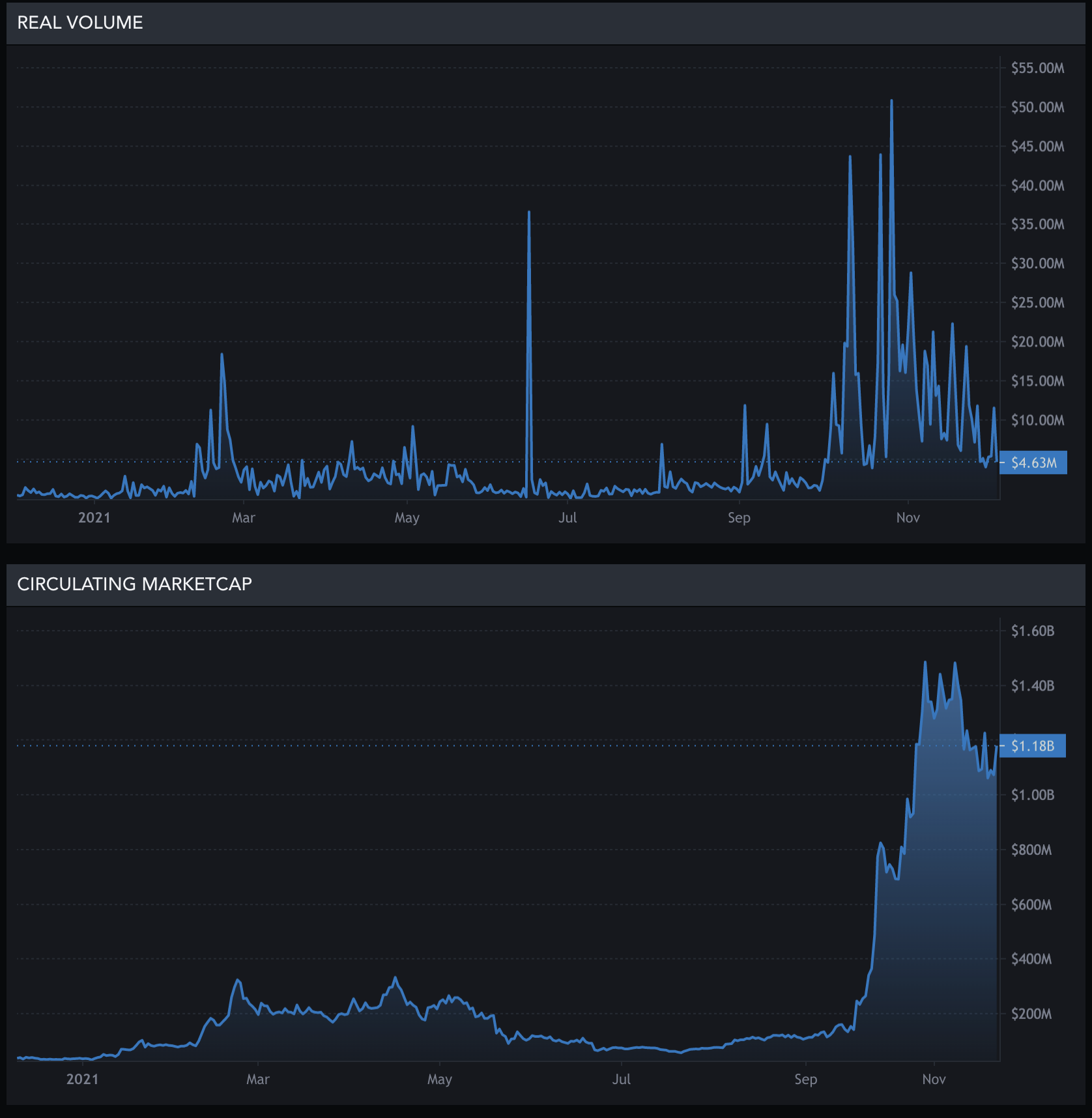 - 실제 볼륨 및 시장에서의 유통량을 보면 21년 10월 이후에 $200M에서 $1B까지 5배 이상 증가하였다.