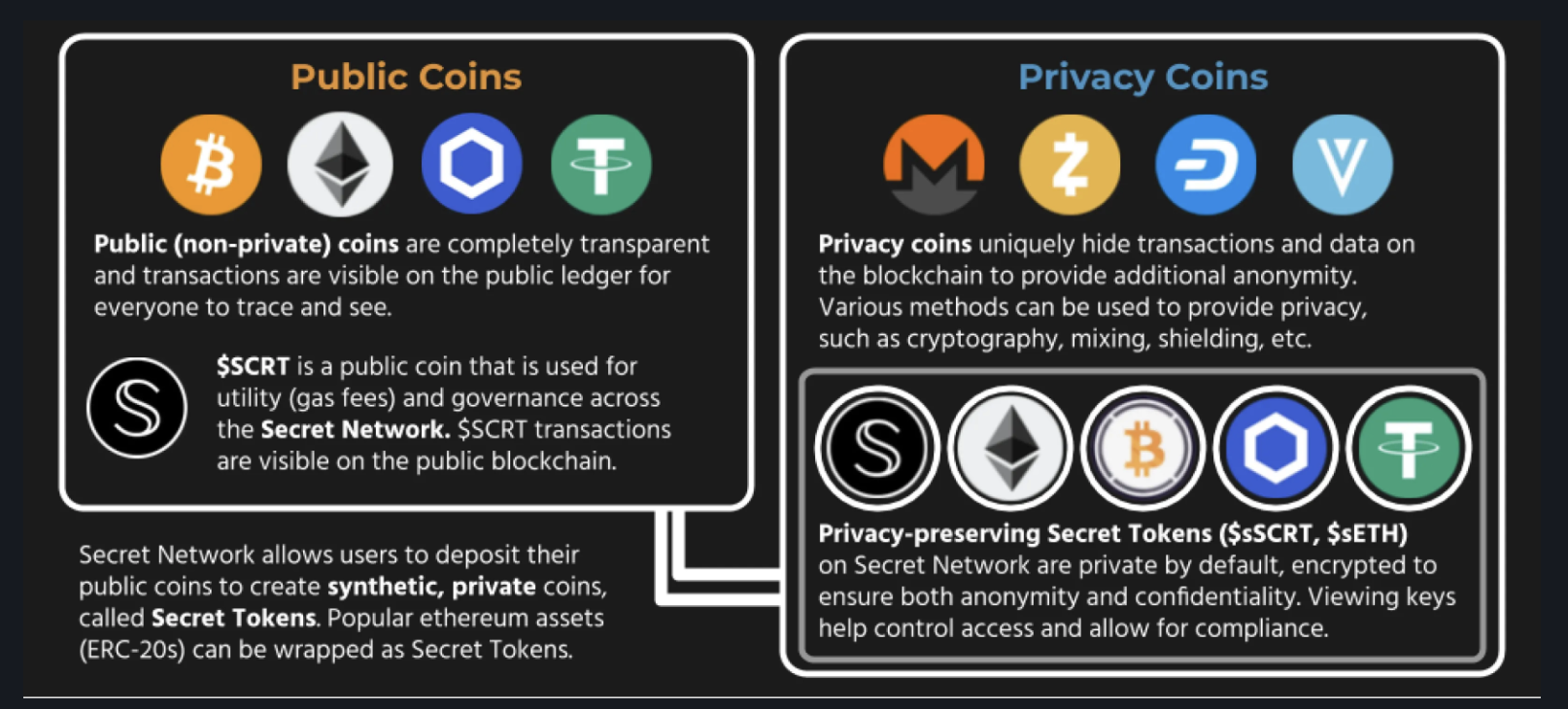 - 기존의 퍼블릭코인과 프라이버시의 코인의 장점을 활용해서 "viwing keys"를 가지고 보안된 시크릿 토큰을 만들수 있다.