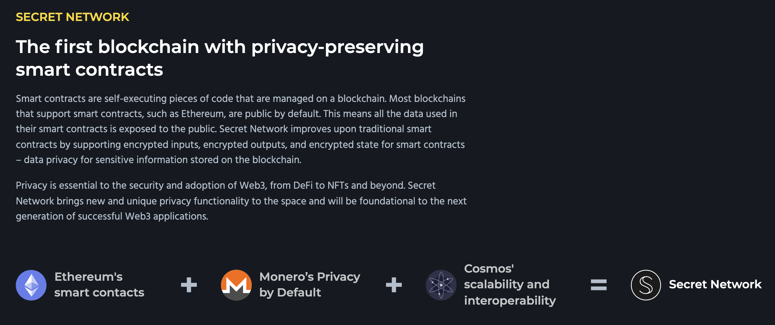 - 이더리움의 스마트컨트랙트, 모네로의 프라이버시, 코스모스의 확장성, 상호운용성의 장점들을 모두 가져와서 시크릿 네트워크를 만들었다.